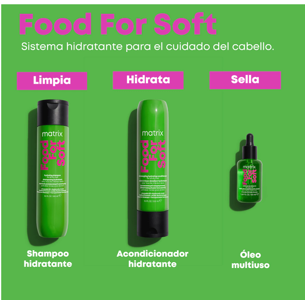 Aplicar de medios a puntas y deja actuar durante un minuto. Enjuagar. En caso de contacto con los ojos, enjuagarlos inmediatamente. Seguir con aceite.Utilizar el sistema completo con el shampoo y óleo Food For Soft.