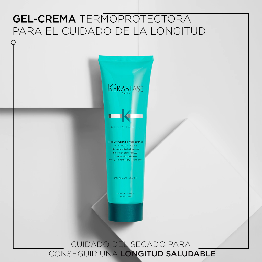 KérastaseResistence Extentioniste Thermique es una crema termoprotectora para usar con secador y herramientas de peinado con calor, diseñada para sellar los largos y las puntas abiertas. Su combinación de Glaçage Thermo-Ceal + Creatina R + Taurina, sella intantáneamente y renueva la fibra capilar después de una aplicación. Esta suave crema en gel protege el cabello del calor hasta 230°C para reducir el quiebre. Dejará tu cabello fuerte, resistente y puede crecer más mientras se mantiene saludable.