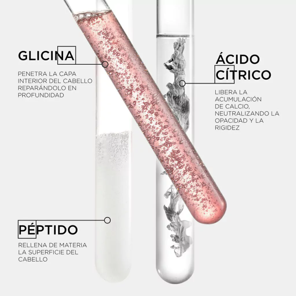 Este tratamiento profesional elimina la acumulación de calcio* reparando el cabello y neutralizando la rotura. El cabello recrea el 99% de su fuerza original**, así como una hidratación y fluidez impresionantes. Su textura ligera y gelatinosa envuelve el cabello, dejándolo suave y flexible con una irresistible fragancia cítrica.
