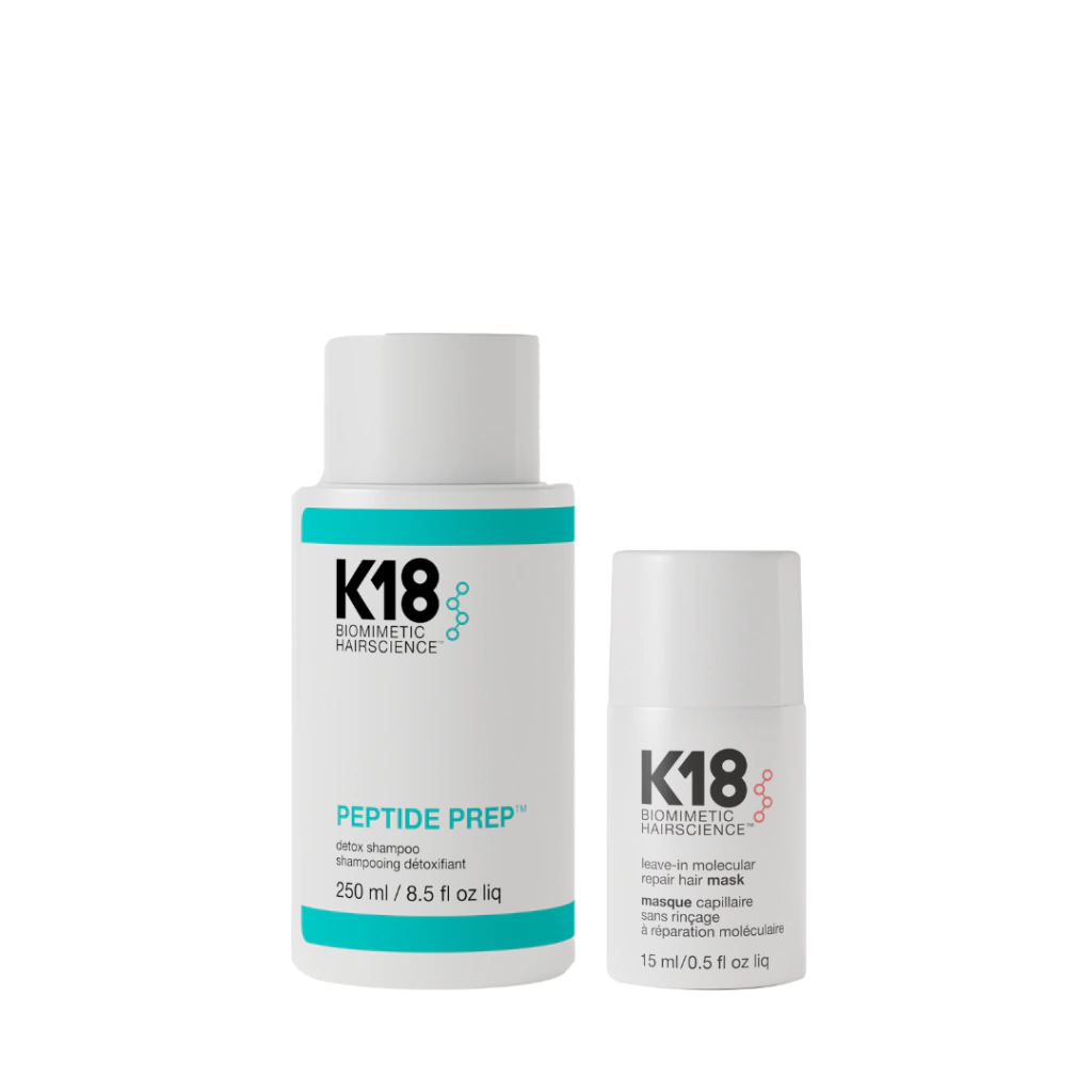 Este combo reúne el poder del Shampoo Detox de K18 y la Máscara Molecular Repair K18 para ofrecer un tratamiento completo que desintoxica profundamente el cabello y lo repara desde el interior, sin dañar el color ni la fibra capilar.