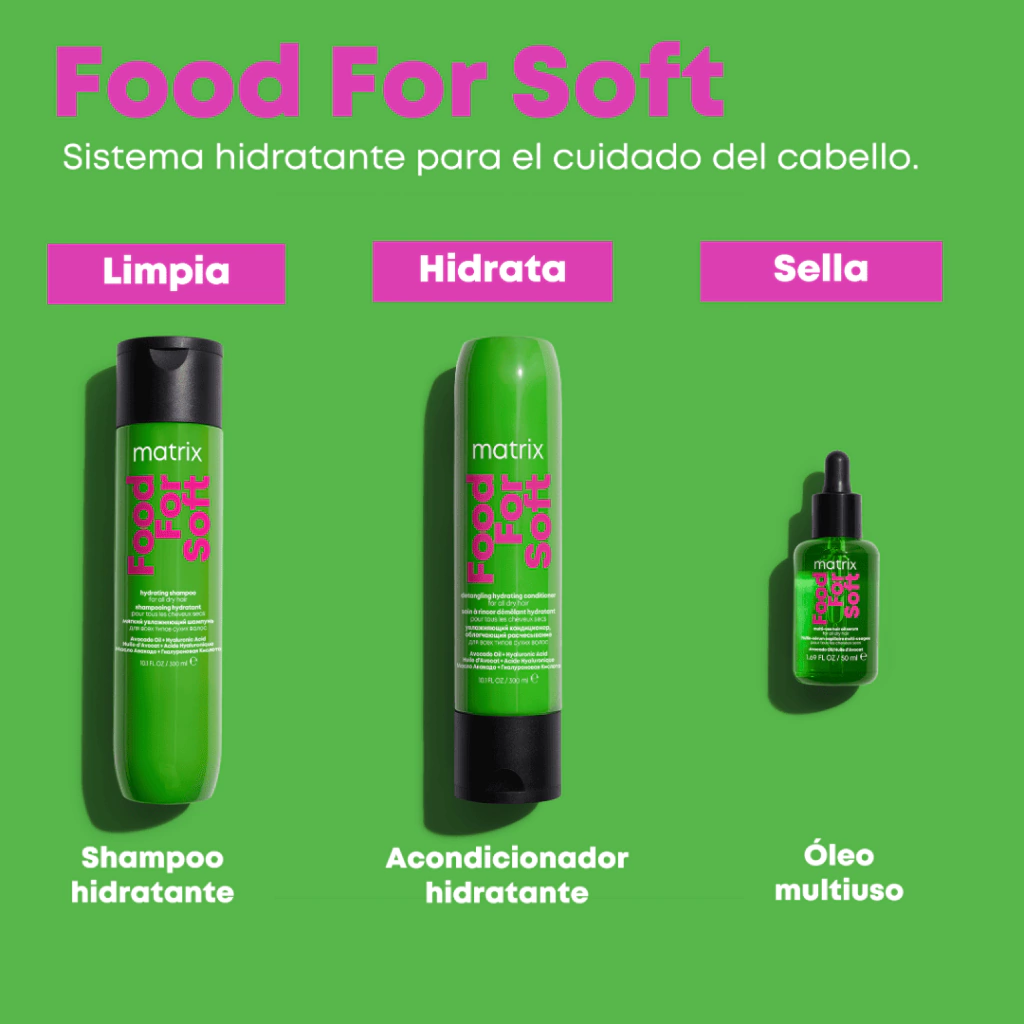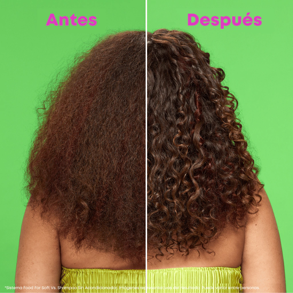 Aplicar en dos tiempos. El primero para limpiar y el segundo para tratar. Dejar actuar de 3 a 5 minutos antes de enjuagar. En caso de contacto con los ojos, enjuagarlos inmediatamente. Utilizar el sistema completo con el acondicionador y óleo Food For Soft.